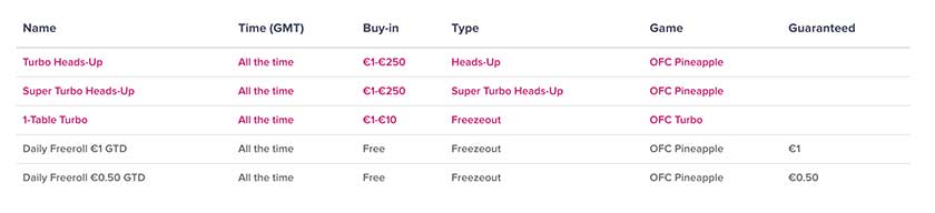 Players who weren’t too concerned about the TonyBet OFC Poker Championship could still opt to compete at OFC and plenty of other poker variants in the comfort of their own homes thanks to the numerous online tournaments the poker room offered. There used to be tournaments like the €5 Guaranteed Jasper which had a €.75 buy-in and was available multiple times a day. For players who wanted to try out the poker room but don’t want to spend real money yet, there were Freebuy play money tournaments which featured €25 guaranteed prizes that anyone could join for free.